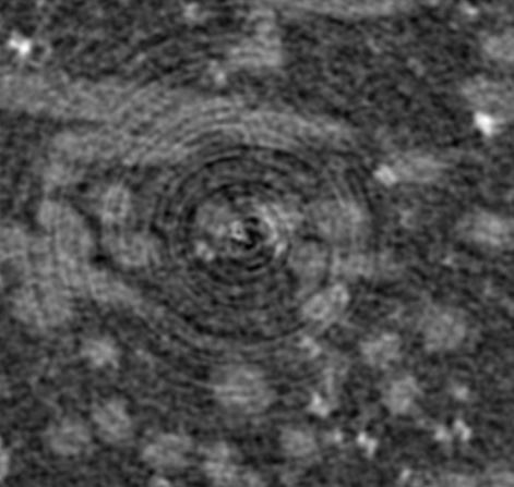 実際の撮影軌道に誤差があって円周にならない場合、アーチファクトの特徴は同心円のリングにならないです。そのため、従来のリングアーチファクト軽減手法は役に立たなくなります。
